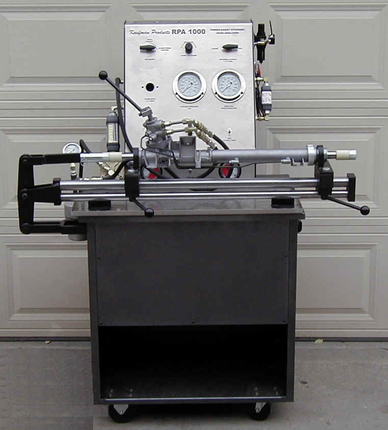 The RPA 1000 is a new state of the art steering gear tester designed and manufactured by Kaufman Products. It has been built on the same proven platform as the Branick RPA 700. The tester comes with a larger 10 gallon reservoir and the control panel has been moved back five inches to give the operator more working area. We have also increased the length of the rack vise mount six inches to allow for longer racks to be mounted to the tester.The RPA 1000 incorporates several additional features to enable it to test all current model steering gears. To begin with, the RPA 1000 has the ability to vary and measure the flow rate in gallons per minute through the gear. This is a necessary feature to truly test the steering gears that come on many vehicles manufactured after 1993 because the variable assist steering valve is mounted in the steering pump. Since the steering effort is varied by flow rate at the pump, to properly test the gear you must be able to vary the flow rate while testing the gear under load to verify it is functioning correctly. We have further upgraded the RPA 1000 with a 12-volt test system. This will allow you to correctly test Saginaw Magnasteerฎ and ZF Servotronicฎ gears along with many other gears that have electrical components regulating the power assist. Finally, the RPA 1000 incorporates an absolute filtering system on both the pump inlet and the system return hydraulic lines. These filters are monitored with filter gauges to let the operator know when they need to be replaced. These absolute filters eliminate pump and valve failure due to oil contamination. For rebuilders with the RPA 700 testers, we can update your tester to the RPA 1000 for a nominal fee.